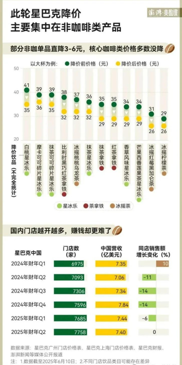 为扭转局面,星巴克在2025年采取了一系列激进措施。6月,品牌首次主动下调10款非咖啡饮品价格,大杯冰摇红莓黑加仑从31元降至26元,白桃星冰乐从41元降至35元,平均降幅达5元,打破了其25年来坚持的价格策略。但即便如此,其价格仍比瑞幸、库迪等本土品牌的主流价格高出一倍多。